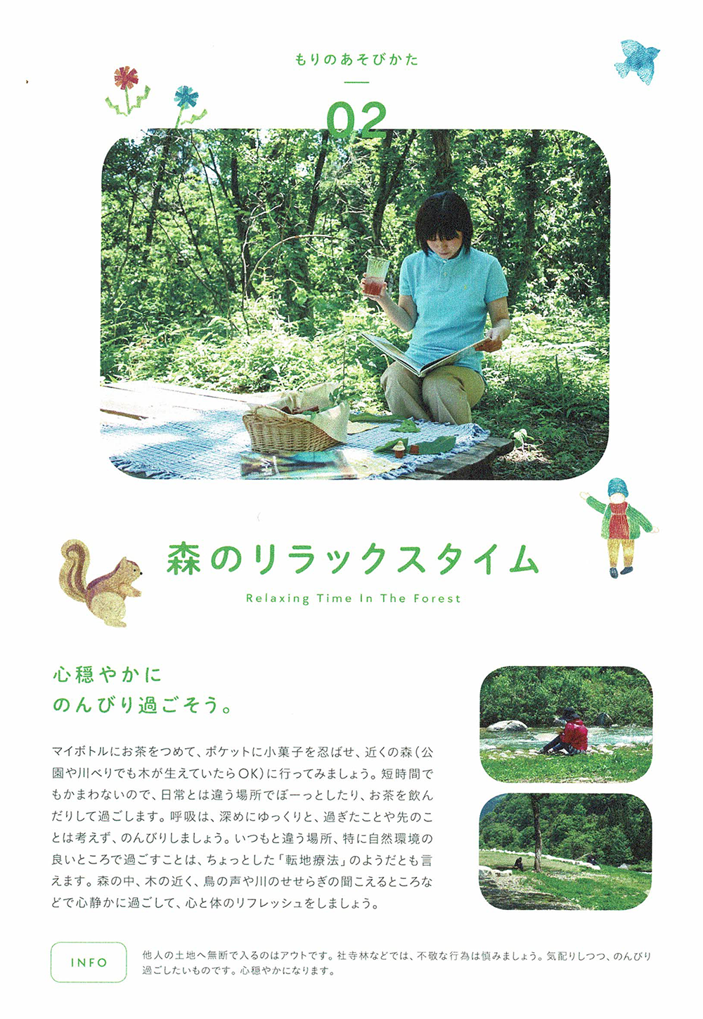 大がかりな施設を整備したり、立派な組織をつくったり、そんな必要はありません。 誰でも、どこでも、いつでも身近な森を楽しんで 健康に、しあわせに暮らしていきたいです。